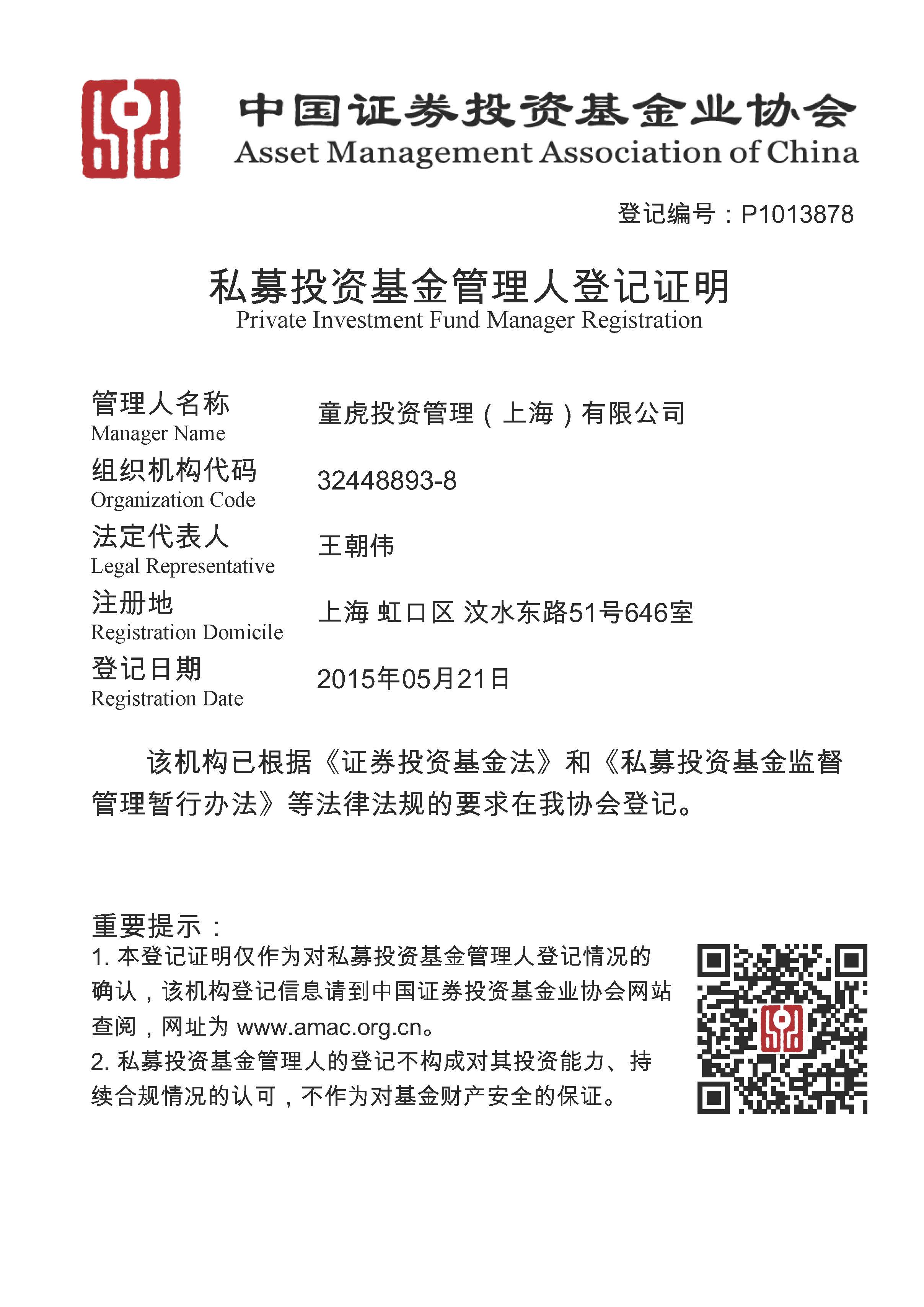 童虎投资管理(上海)有限公司于2015年5月21日获得由中国证券投资基金业协会颁发的私募投资基金管理人登记证明。